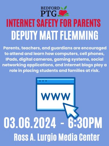 Community Presentation: Internet Safety for Parents with Deputy Matt Fleming MARCH 6th, 6:30pm Ross A. Lurgio Media Center Share this: Click to share on Facebook (Opens in new window) Facebook Click to email a link to a friend (Opens in new window) Email Click to print (Opens in new window) Print Related Bookmark the permalink.